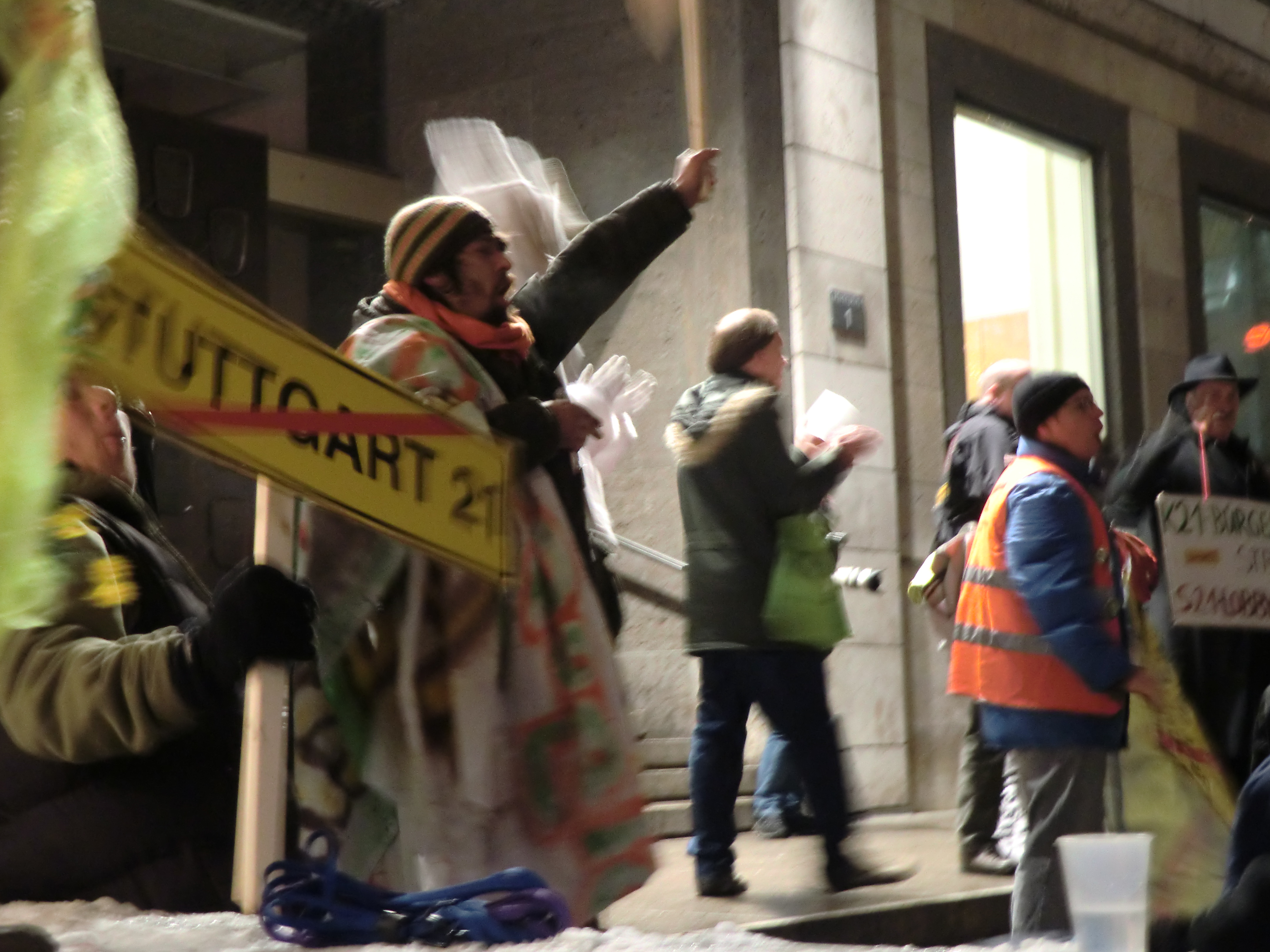 My second night in Stuttgart I was walking through the snowy Christmas Market when I heard a screeching racket like hundreds of kazoos being abused. I walked in the direction of the noise and found myself at a Stuttgart 21 protest outside City Hall. I’d encountered a handful of protestors at the train station the night before, but this was far bigger and more organized. There were, yes, kazoos, and costumes, and signs, and a song about the train station set to the tune of Beethoven’s Ode to Joy, and chants of “Oben Bleiben” which means “keep it above ground” (a reference to the undergrounding of the station and the tunnels). My favorite part was the dancing, chain-smoking white rabbit mascots.