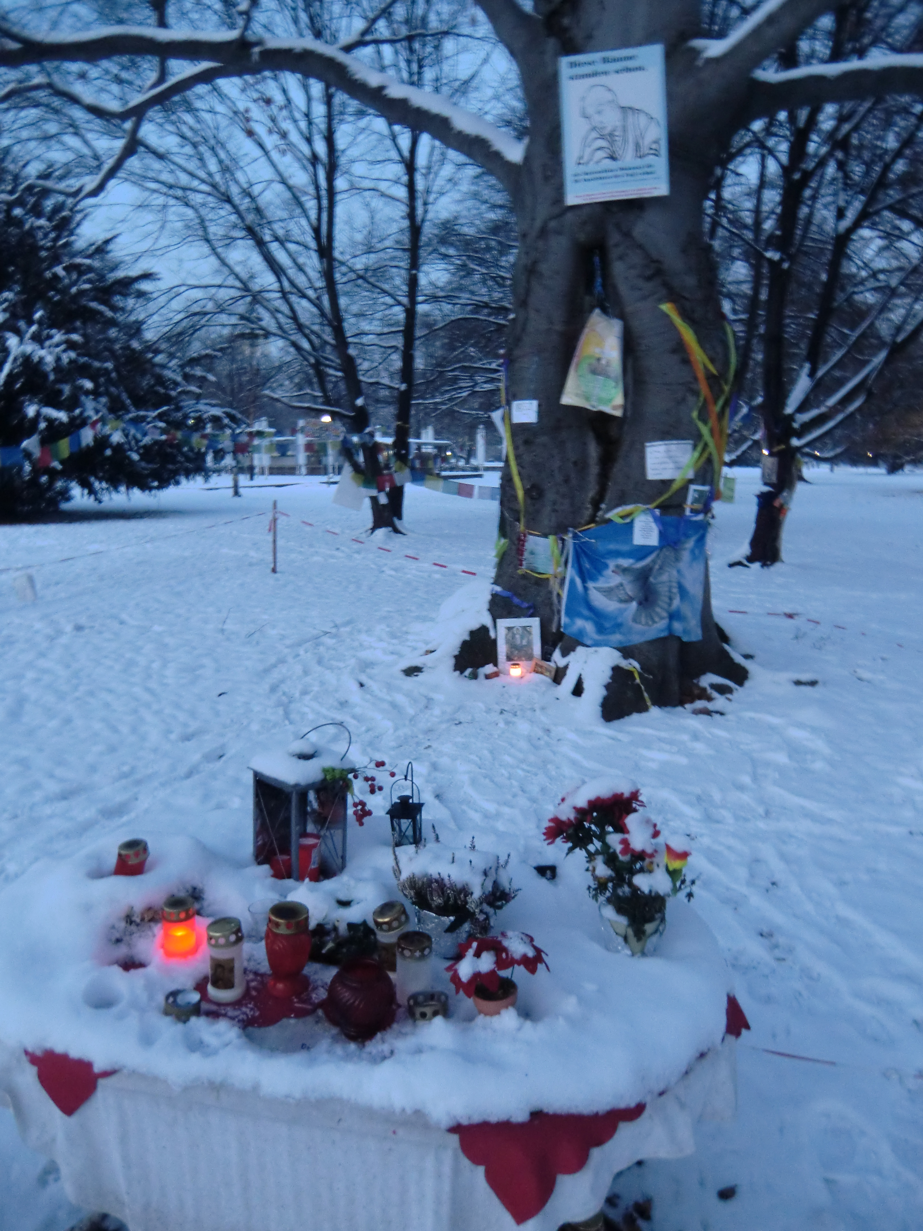A shrine at the base of a tree slated for destruction. The german word for felling trees? Hack.